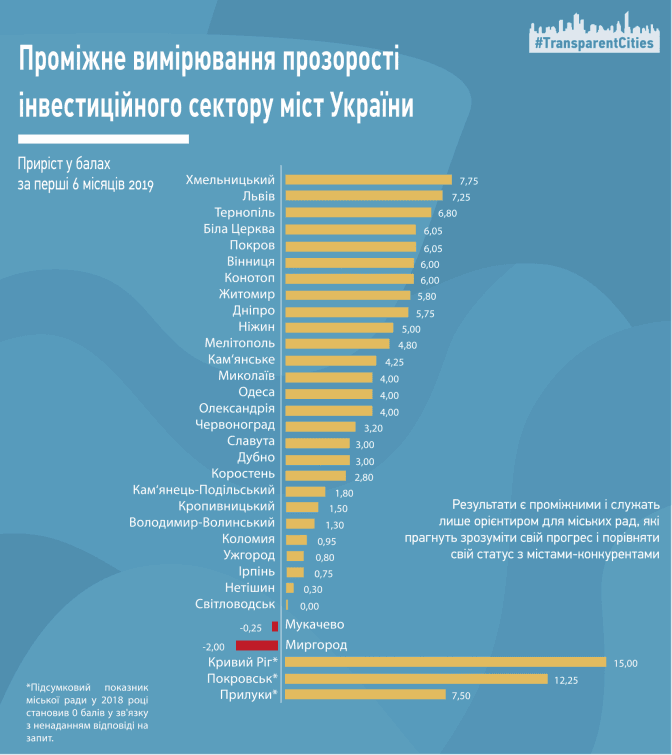 Наразі проміжний рейтинг складений на основі даних, отриманих від 32 міст. Ті ж, що на запити Трансперенсі Інтернешнл Україна не відповіли, не оцінювали.
