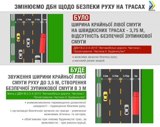 На дорогах І категорії ліві смуги звужуватимуть із 3,75 до 3,5 м. Ідеться про траси з трьома і більше смугами в одному напрямку. Ширина зупинкової смуги на дорогах І та ІІ категорій становитиме 2,5 м замість 3 м. Нині, за словами Лева Парцхаладзе, ширина смуги стає причиною аварій, особливо з вантажівками, які не можуть повноцінно пересуватися цією ділянкою дороги.