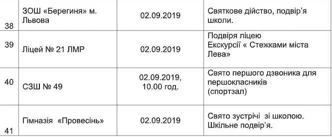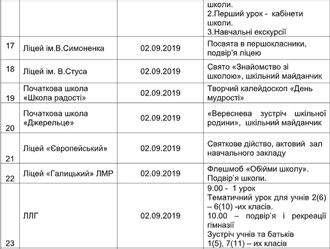 У неділю, 1 вересня, розпочався новий навчальний рік. Майже всі школи Львова, окрім двох (ЛСЗШ Будокан та ліцей імені Івана Пулюя), перенесли святкові заходи на понеділок, 2 вересня. Про це Tvoemisto.tv повідомили у пресслужбі ЛМР.