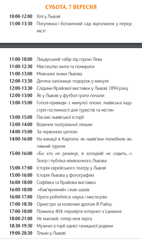 Цьогорічна тема «Мистецтво і розваги львів’ян в часи #безінтернету». Події охоплюють широкий відрізок часу, від заснування Львова і аж до 90-х років минулого століття. У відвідувачів буде можливість потрапити на екскурсії за лаштунки цирку й театрів, зокрема театру Заньковецької, Першого театру і театру «Воскресіння». Окрім цього, гостей очікуюють лекції: святкування Дня міста в різні епохи, розвиток фотографічного мистецтва, відпочинок львівської інтелігенції та навіть розваги в часи війни. Загалом цьогоріч відбудеться 65 подій.