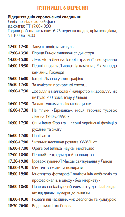 Усі заходи в межах Днів європейської спадщини є безкоштовними. Кількість місць на більшість заходів обмежена. Реєстрація триває з 2 вересня до 15:00 год 5 вересня, а також за телефоном 067 373 36 52. Реєстрація он-лайн — цілодобова, телефоном — з 10:00 по 16:00.