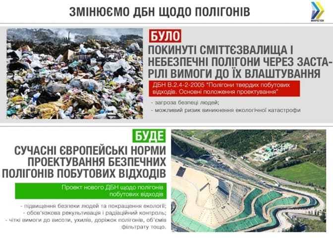- Чіткі вимоги до висоти полігонів, його ухилів, розташування доріг і трас, розміщення промислових та інших побутових відходів на полігонах;