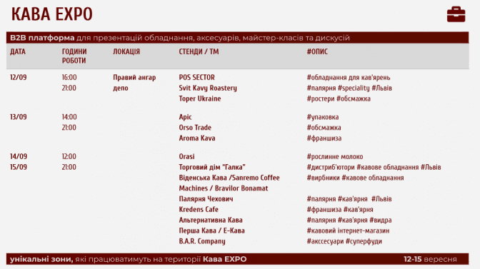 13:30 – презентація «Виробництво кави на промислових ростерах TOPER». Лектор – представник Toper Ukraine Роман Косович.