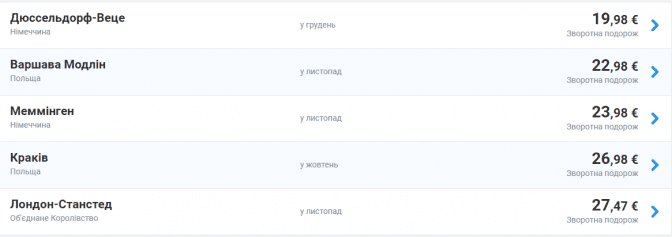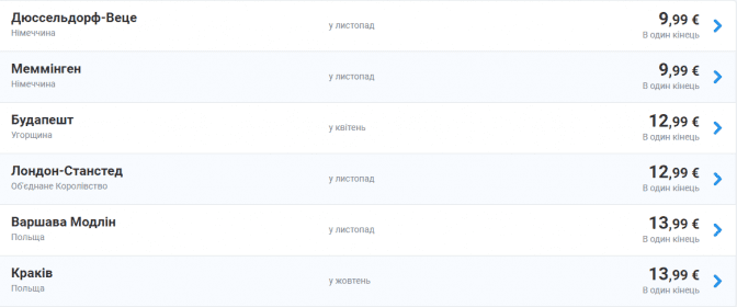 Зі Львова з жовтня 2019 року до січня 2020 року за 9,99 євро можна полетіти у німецькі Дюссельдорф та Меммінген, а також – у Варшаву. За 13 євро доступні квитки у Лондон і Краків.