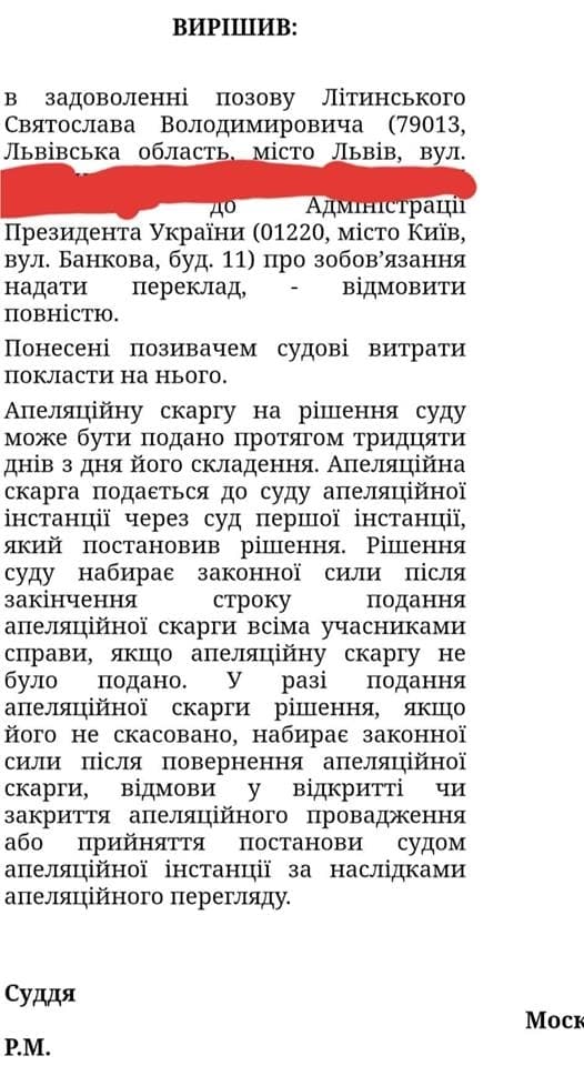 Втім, Офіс президента відповіді не надав, тож активіст звернувся до суду, але суд відмовив йому у задоволенні позову. У Святослава Літинського є 30 днів для подання апеляції. У коментарях до свого допису у відповідь на слова коментаторів про те, що це "наївно", активіст зазначив, що позови проти Арсена Авакова, Хатії Деканоїдзе та інших також здавались наївними, проте він переміг і домігся перекладу на українську мову, як цього вимагає українське законодавство.