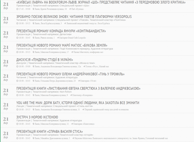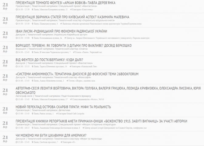 Цьогорічна програма культурного фестивалю налічує понад 800 заходів та 30 тематичних напрямків, повний перелік яких можна переглянути тут. Окрім цього, на сайті Форуму можна знайти різні підбірки подій: куди піти на 26 Book Forum, якщо мене звуть Олександр(а), куди піти на фестивалі з дітьми, 6 авторів з книжками про подорожі тощо.