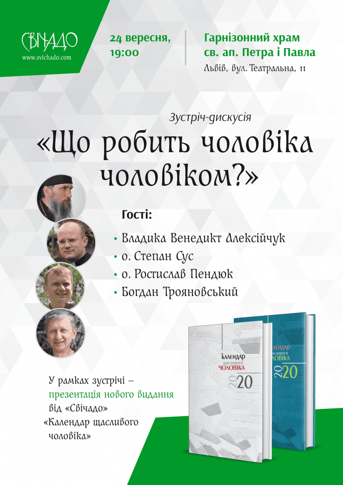 Також у межах зустрічі презентують нове видання «Свічадо» «Календар щасливого чоловіка». Йдеться про зручний календар-щоденник з влучними цитатами, порадами психологів, рекомендаціями щодо здоров’я, рецептами легких у приготуванні страв. Окрім цього, у календарі підготували роздуми над уривком зі Святого Письма разом із владикою Венедиктом Алексійчуком.