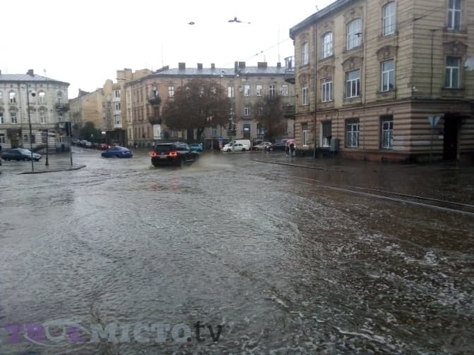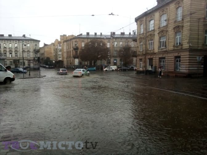 У Львові короткочасна злива спричинила затоплення вулиць. Особливо постраждали від дощу найбільш підтоплювані ділянки, як от перехрестя вулиць Сахарова та Вітовського.