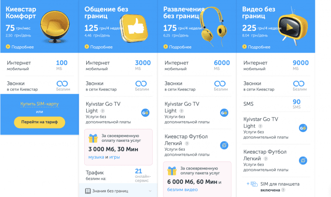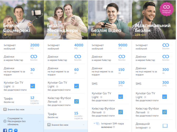 - тариф «4 безліміти» (40 грн): безлім всередині мережі, безлім на відео, Facebook, месенджери, 100 МБ інтернету на день і 30 хв на інші мережі;