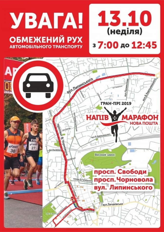 Через біговий напів марафон частину вулиць міста буде закрито для руху транспорту. Зокрема у неділю, 13 жовтня, з 7.00 до 12.45 перекриють або обмежать рух транспорту на різних ділянках маршруту на проспекті Свободи, проспекті Чорновола, вулиці Липинського та суміжних вулицях.