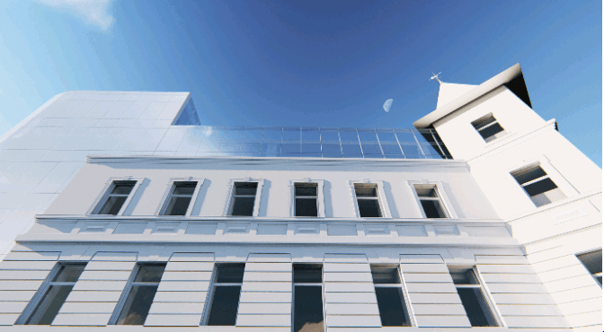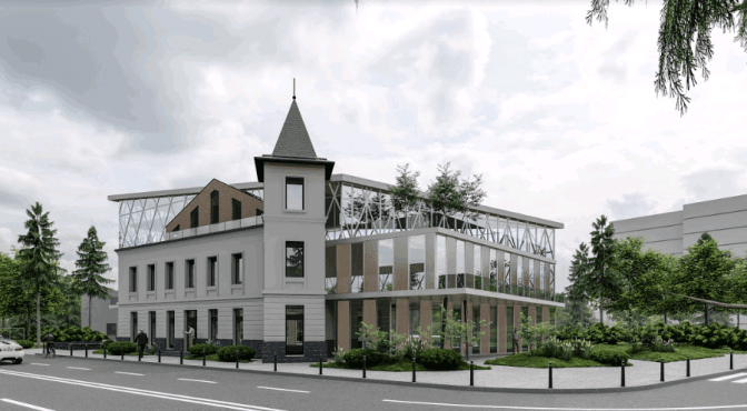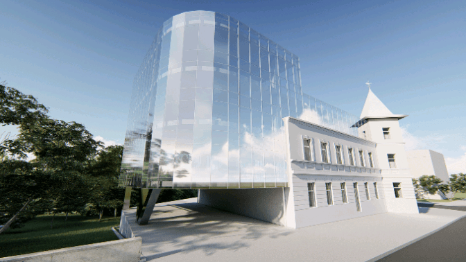 «Для добудови обрали ті матеріали, які вигідно зіграють на контрасті з будівлею. Також ми пропонуємо відновити покриття даху, фасад з вежею зробити в одному кольорі, а фонову будівлю – в іншому», – каже студентка-архітекторка Соломія Ганець.