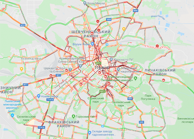Згідно з мапою заторів Google Maps, найбільш паралізованими залишаються проспект Чорновола, вулиці Городоцька, Підвальна, Винниченка, Коперника, Личаківська, проспект Свободи. Стежити за актуальною картою заторів можна за посиланням. На цих же вулицях стались аварії, що також блокують рух.