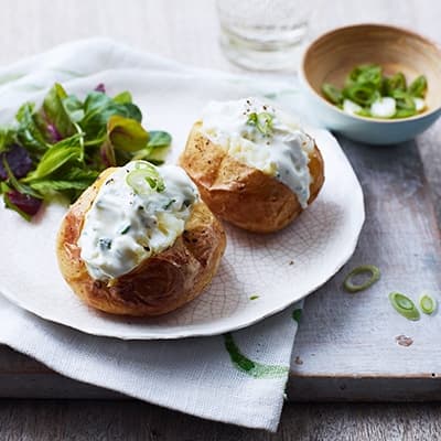 Подив та смакову насолоду принесе проста страва з картоплі та крем-сиру Philadelphia з зеленню. Візьміть кілька картоплин, вимийте їх та змастіть оливковою олією. На деко, застелене папером для випічки, викладіть картоплю і запікайте у розігрітій до 190 °C духовці 45-50 хвилин, поки картопля не буде готова. Почистіть 2 ріпчасті цибулі, наріжте кільцями і перемішайте її з крем-сиром. Приготовлену запечену картоплю розріжте навпіл і на кожну викладіть по ложці сиру. Страву подайте з будь-яким салатом.
