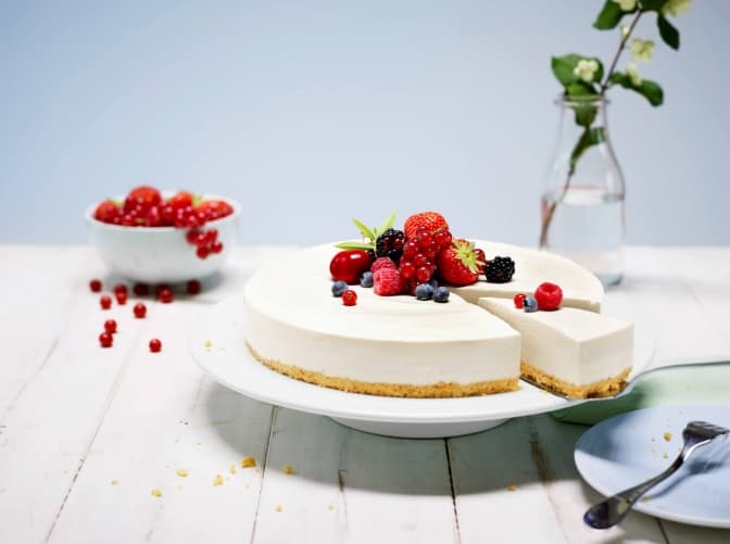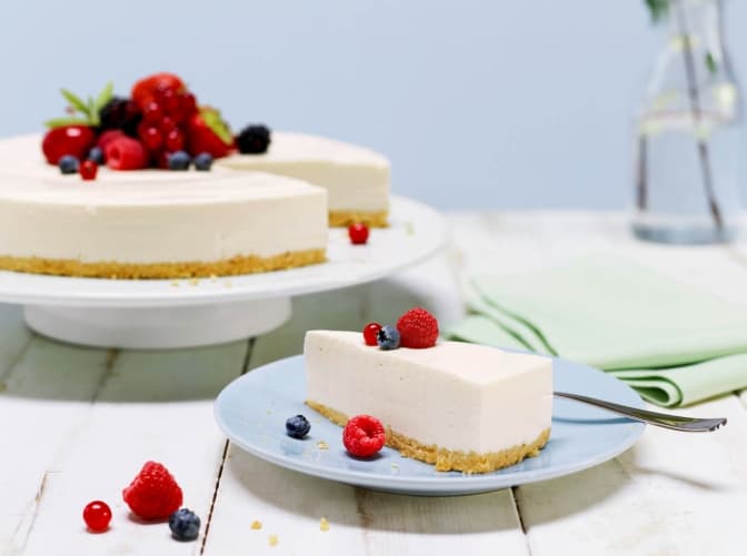 Для цього підготуйте 150 г пісочного печива або бісквіту, 125 г масла, 2 пачки крем-сиру Philadelphia Original XL (по 300 г), 300 г йогурту (3,5% жирності), 3 ст. л. ложки лимонного соку, 1 пачку желатину, 75 г цукру та фрукти на вибір (для декорування).