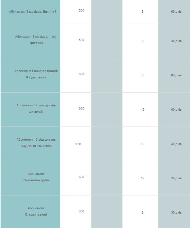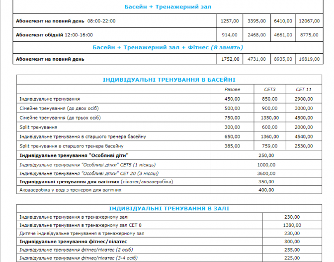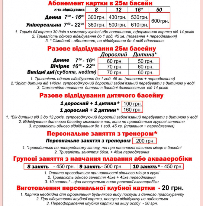 У Палаці є 4 доріжки довжиною 20.5 м, глибиною 2 м. Разовий вхід для дитини 52 грн, однак вона обов’язково має бути в супроводі дорослого – когось з батьків або тренера. Для дорослих разовий вхід коштуватиме 60 грн. Абонементи на місяць однаково коштуватимуть як для дітей, так і для дорослих – 570 грн. Час заняття – 45 хвилин.