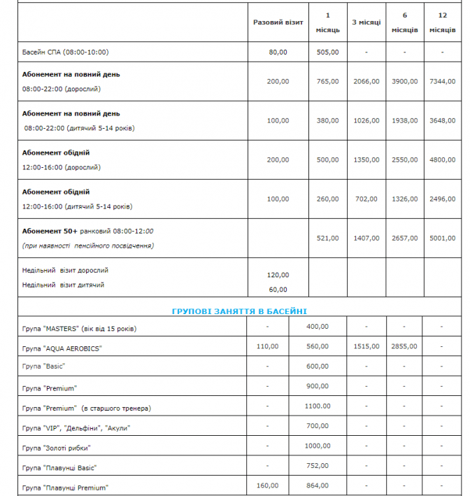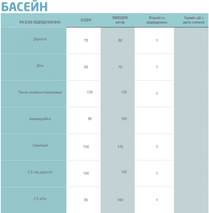 Тривалість користування басейном – 90 хв. (10 хв. для душу до початку заняття і гігієнічної підготовки, 20 хв. – переодягання після закінчення заняття, 60 хв. – плавання).