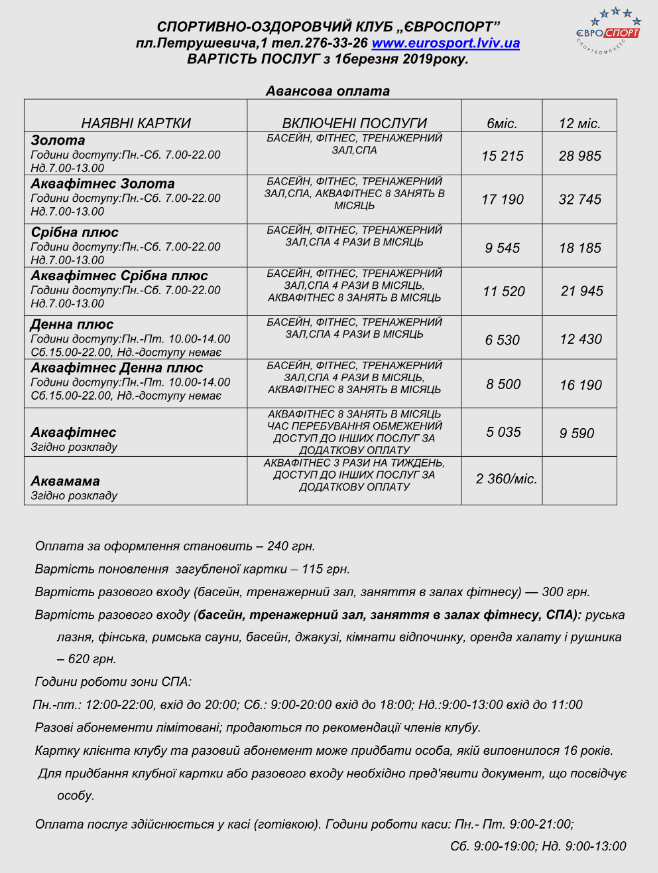 Клуб «Євроспорт» працює з понеділка по суботу з 7:00 до 23:00, а у неділю з 7:00 по 14:00. Він розташований на пл. Петрушевича, 1.