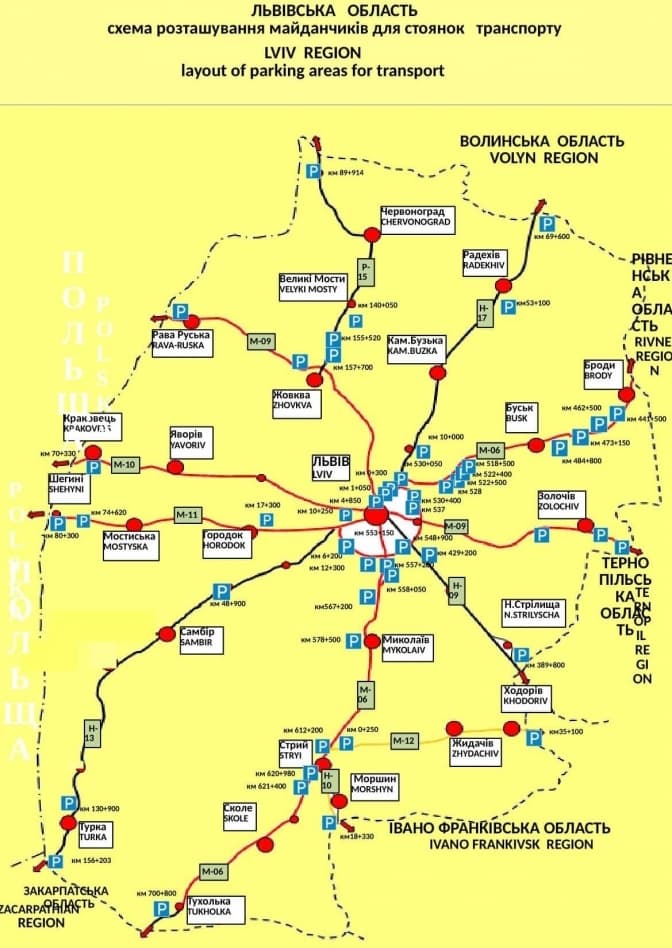 Усього на автодорогах державного значення Львівської області налічують 51 зупинку на 1112 вантажних та 2407 легкових автотранспортних засоби.