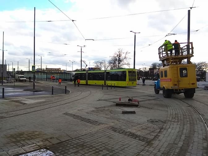 Йдеться про праву частину площі, де розташована автостанція. Цю ділянку повністю віддали під громадський транспорт: тут облаштували кінцеві зупинки для автобусів та трамваїв. Тут уже встановили освітлення, нанесли розмітку, встановили контактну мережу та поклали верхній шар асфальту.