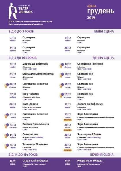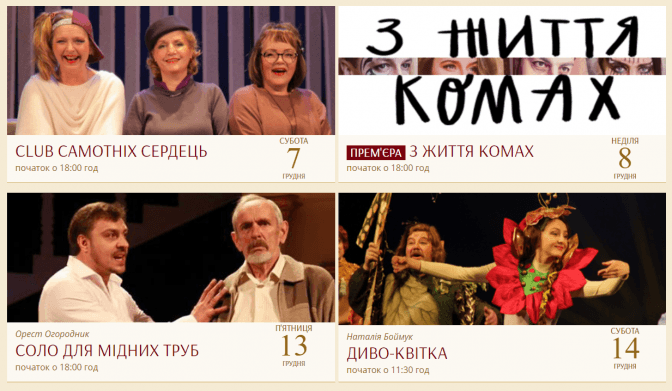 27.12 (п'ятниця) 19:00 – «Мої родичі та інші покидьки», 18+. Сімейна сага за п’єсою «Мать Горького» Лєни Лягушонкової. Тривалість – 1 год. 40 хв. без антракту