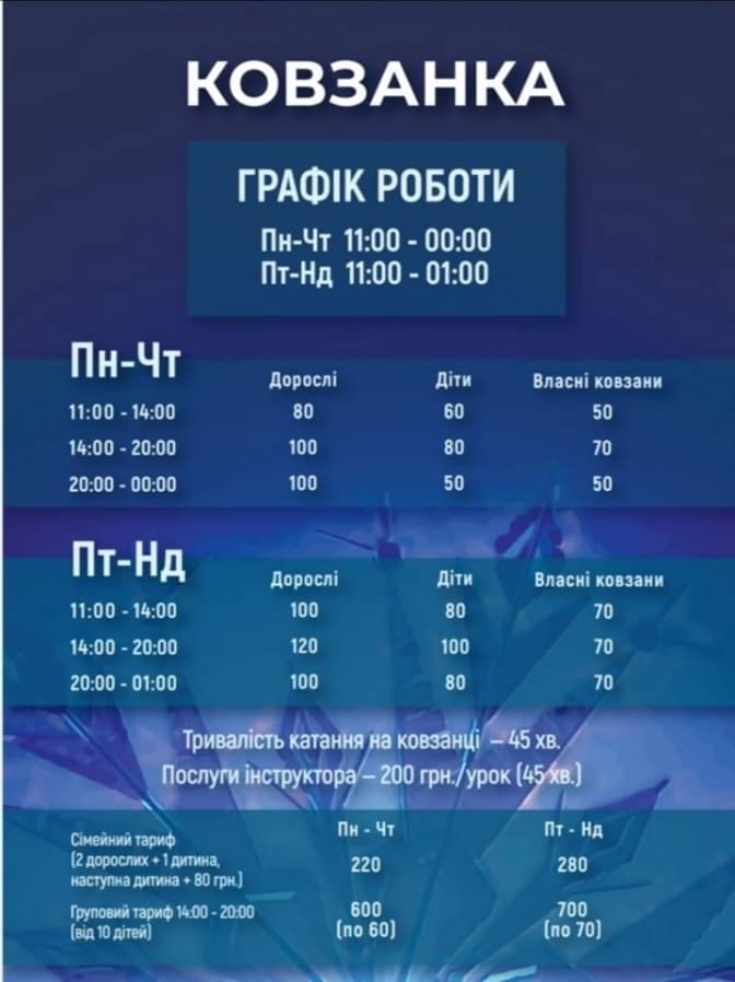 У вартість квитка входить катання на ковзанах протягом сеансу та оренда ковзанів. Тривалість сеансу – 45хв.