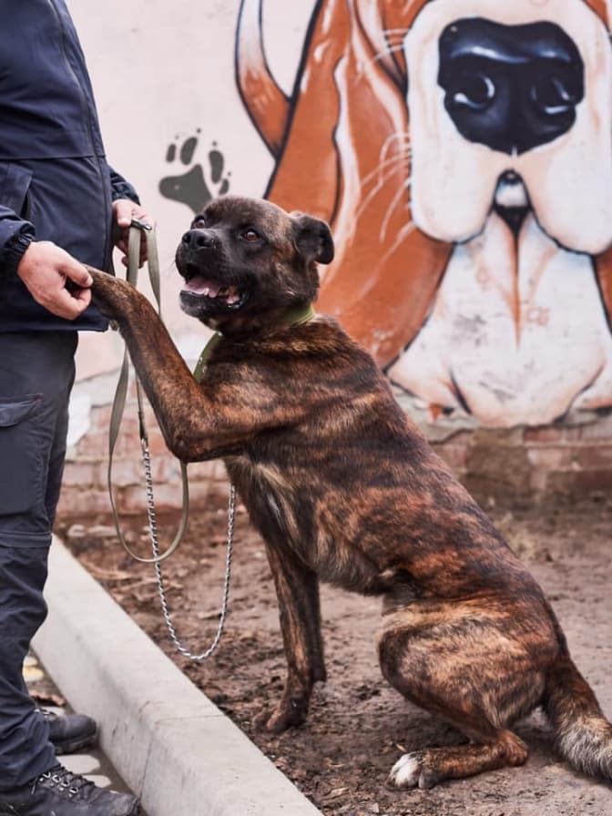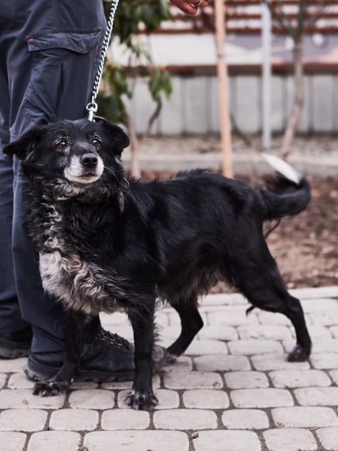 Собака середнього віку Міранда. Має певні проблеми із зором, бо кошишні господарі її занедбали. За характером це добра і лагідна собака, тож чудово підійде в родину, де є діти, які люблять тварин.