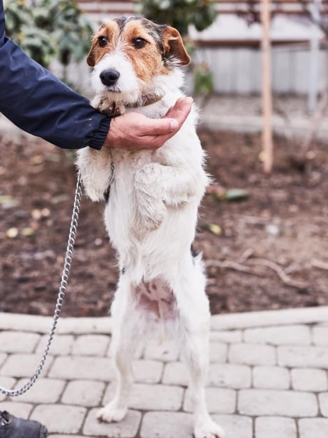 Молода й енергійна метиска ягдтер'єра Харлі. Чотирилапа добре гуляє на повідку, слухняна, має здібності до навчання і все ще чекає на свого господаря.