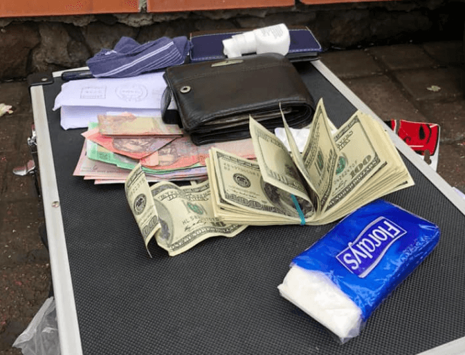 Обох співробітники СБУ затримали відразу після передачі грошей біля пункту обміну валюти, де вони хотіли конвертувати гроші.