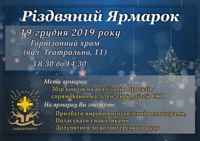 Він відбудеться у Гарнізонному храмі, що на вул. Театральній, 11. Відвідати його можна з 8:30 по 14:30. Мета ярмарку – зібрати кошти на реалізацію проєктів, спрямованих на дітей-сиріт, дітей, які перебувають у складних життєвих обставинах.