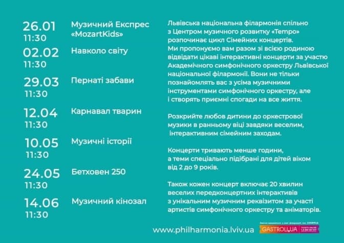 Наступні події циклу відбуватимуться раз на місяць, а усю інформацію про них можна знайти на офіційному сайті Львівської національної філармонії. Про Музичний Експрес «MozartKids» можна детальніше дізнатися за посиланням, а про музичну подорож «Навколо світу» тут.