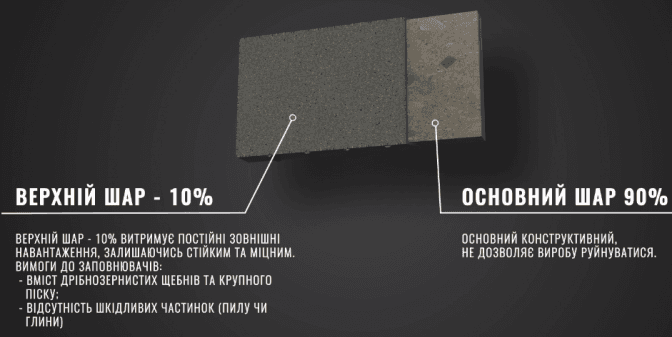 «У матрицю форми завантажують основний шар бетону. За допомогою вібрації, пресу, який пресує під тиском, основний шар бетону ущільнюється. Зверху завантажується верхній облицювальний шар бетону, який також ущільнюється пресом під тиском і вібрується за допомогою вібраторів, за рахунок чого виходить хороше щеплення верхнього шару і нижнього шару, і ми отримуємо якісний продукт.