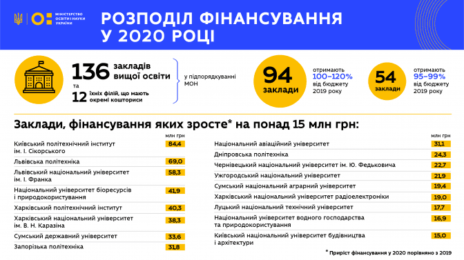 З 2020 року ЗВО фінансуються за формулою, де університети з кращими результатами діяльності отримують більше фінансування порівняно із бюджетом минулого року. Тож цьогоріч більше, аніж торік, коштів від МОН отримають НУ «Львівська політехніка» та Львівський національний університет імені Івана Франка. Ідеться про 69 і 58,3 млн грн відповідно.