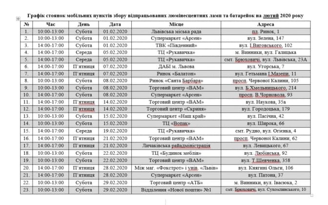 Нагадаємо, що небезпечні відходи збирають безкоштовно лише від мешканців Львова, Винників, Брюховичів та Рудного у кількості: 10 люмінісцентних ламп, до 5 термометрів та до 1 кг батарейок.