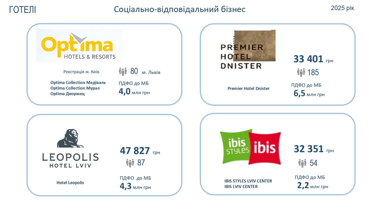 За даними міськради, ПДФО від готелів зріс із 25,0 млн грн у 2024 році до 32,1 млн грн у 2025 році, що на 28% більше. За їхніми словами, це свідчить про поступове зростання прозорості у виплаті зарплат та детінізацію ринку праці.