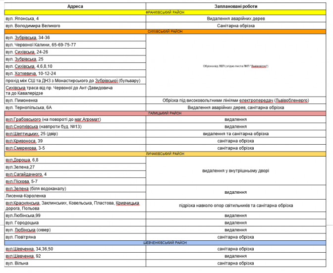 Ідеться про кілька дерев, частина яких ростуть у внутрішніх подвір’ях будинків. На місці видалених дерев обіцяють посадити нові. Ще на восьми вулицях проведуть санітарну обрізку дерев там, де це необхідно.