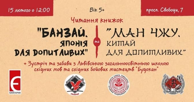 Книгарня «Є» запрошує дітей від 5 років та їхніх батьків на читання книжок «Банзай. Японія для допитливих» Зофії Фаб’яновської-Міцик та «Ман Чжу. Китай для допитливих» Ізабелли Калюти (Видавництво Урбіно) та до знайомства й забав з Львівською загальноосвітньою школою східних мов та східних бойових мистецтв «Будокан».
