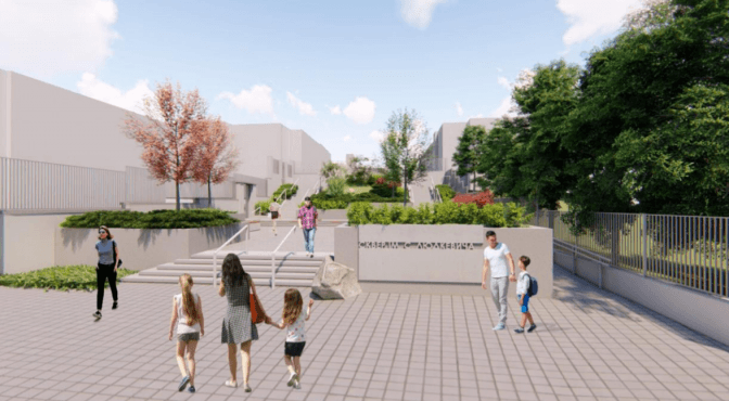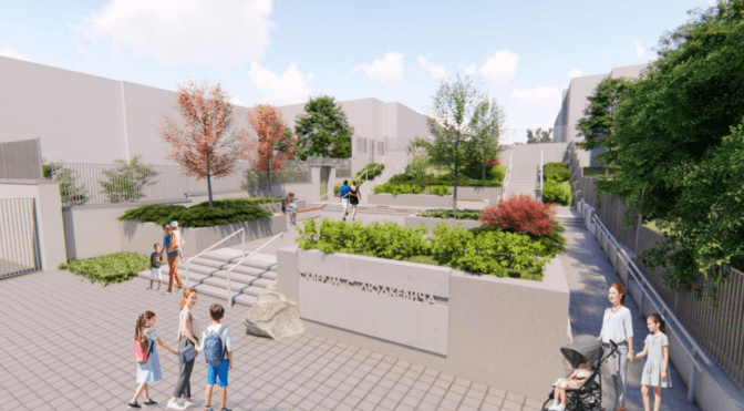 На вулиці розділили господарську частину, де є гаражі, та відвели місце для громадського простору. Нині тут розташовані аварійні сходи.