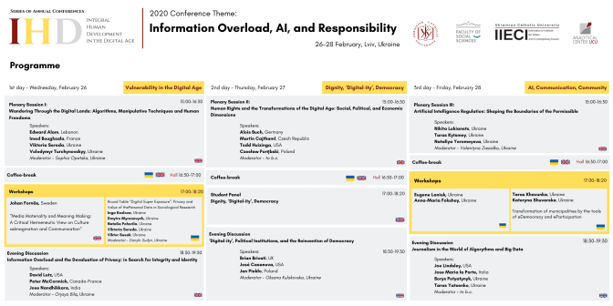 Участь у конференції візьмуть понад 30 міжнародних спеціалістів із цифрових комунікацій, ІТ-технологій, філософії та теології, які говоритимуть про тематику «Інформаційне перевантаження, AI (штучний інтелект) та відповідальність».