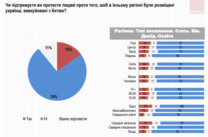 Соціологічна група «Рейтинг» протягом 22-23 лютого опитала 1200 старших за 18 років українців в різних регіонах щодо їх ставлення до протестів проти розміщення евакуйованих з Китаю українців.