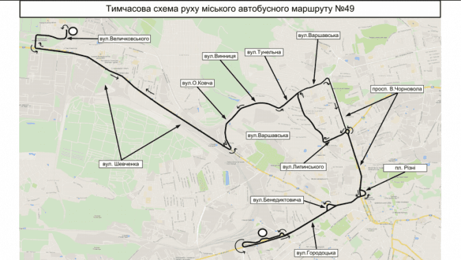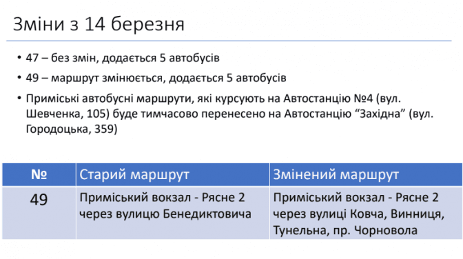 Із 7 березня автобус №6Н їхатиме через проспект Чорновола, Тунельну, Винницю та Ковча, а автобус №17 курсуватиме через вулиці Щурата, Сяйво та Городоцька. З 14 березня автобус №49 курсуватиме через вулиці Ковча, Винниця, Тунельна, Варшавська, Липинського, проспект Чорновола, площу Різні, Бенедиктовича та Городоцьку. Трамвайний маршрут №7, який сполучає Погулянку і Татарбунарську, із 14 березня скоротять лише до церкви Анни. На маршрути №49 та 47а (курсуватиме без змін) додадуть по п’ять автобусів.