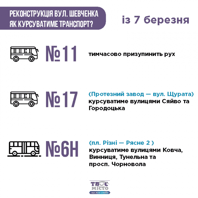 Водночас автобус №49 замість Шевченка їхатиме по Тунельній, Винниці та проспектом Чорновола. По 5 автобусів ще 7 березня додали на маршрут №47а, що їздить через Тунельну до Рясного.