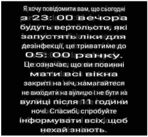 Впродовж дня 16 березня у месенджерах почали поширювати картинки з закликом зачиняти вікна, бо о 23:00 над містами, при чому, такі фейки розповсюджували у різних містах країни, літатиме гелікоптер, що розпилюватиме антисептичні дезінфікуючі засоби. Тож мешканцям радили зачинити домашніх тварин удома і не виходити на вулицю до 5:00 ранку 17 березня.