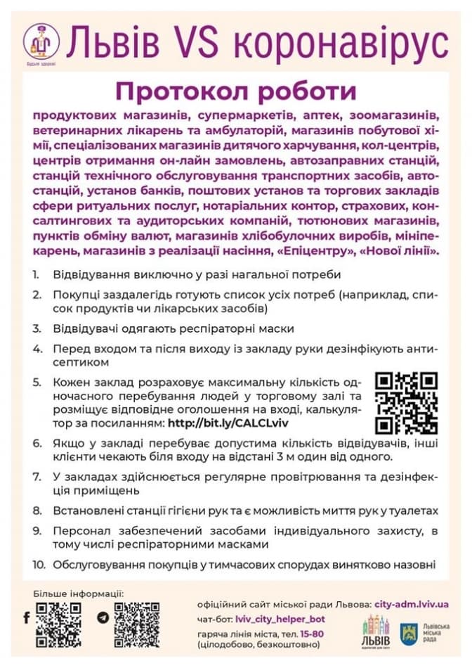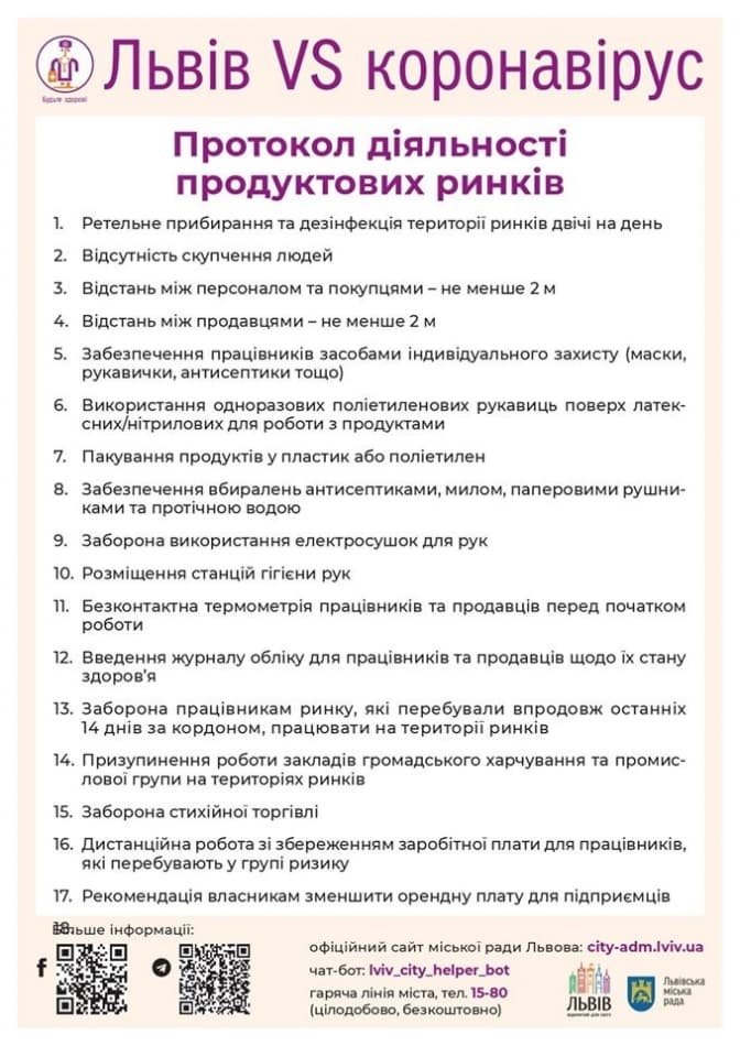На сторінці Львів VS Коронавірус оприлюднили протоколи для роботи низки закладів, ринків та доставки на період карантину.