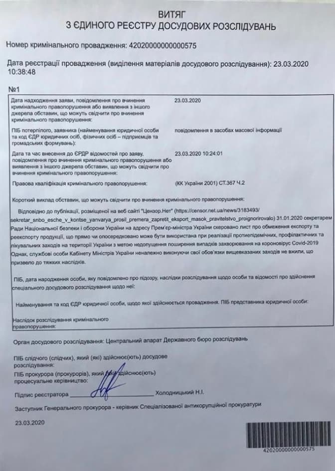 Як повідомили у пресслужбі САП, відповідно до оприлюдненої інформації 31 січня 2020 року та 8 лютого 2020 року секретар Ради Національної безпеки та оборони України скерував на адресу прем'єр-міністра, ким на той час був Олексій Гончарук, листи про нагальну необхідність обмеження експорту та реекспорту продукції, що може бути використана при реалізації протиепідемічних, профілактичних та лікувальних заходів на території України з метою недопущення поширення випадків захворювання на коронавірус Covid-19.