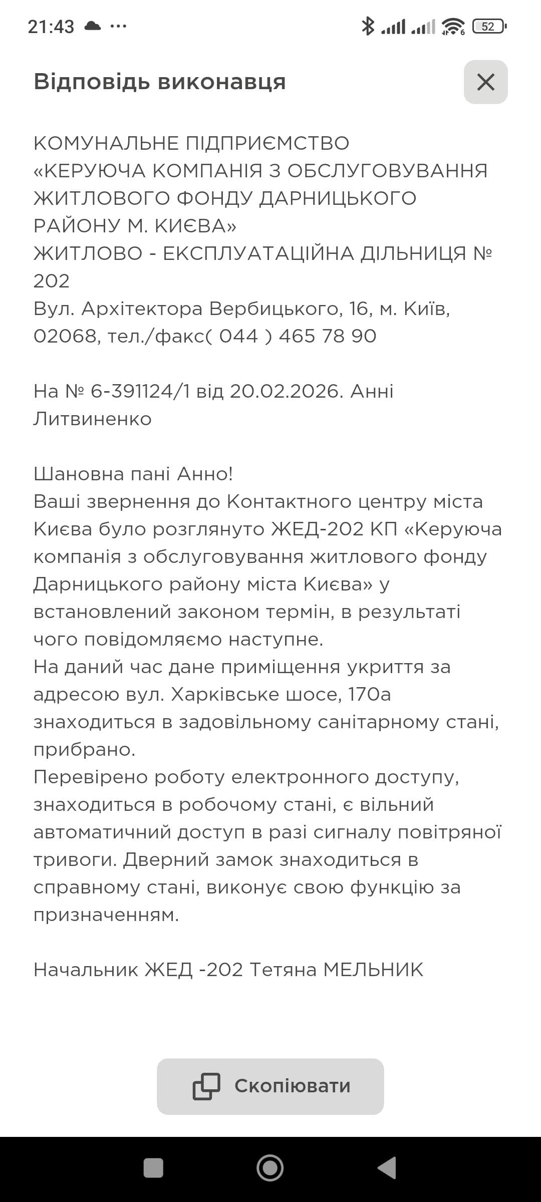Наразі мешканці змушені ігнорувати сигнали повітряної тривоги або шукати інші місця для захисту, оскільки власне укриття стало епіцентром антисанітарії та загрози здоров’ю. Анна Литвиненко від імені громади просить про допомогу Дарницьку районну державну адміністрацію, сподіваючись, що це остання інстанція, здатна змусити комунальників виконати свою роботу — відремонтувати двері та провести реальну дезінфекцію приміщення.