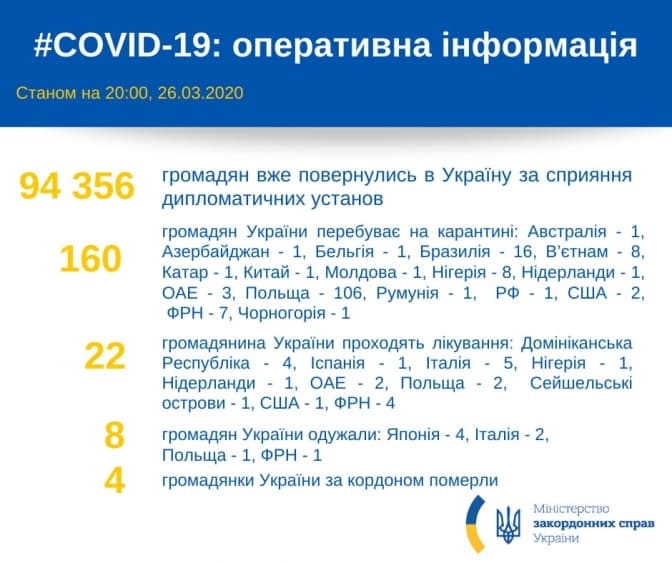Загалом на карантині в різних країнах світу перебувають 160 українців, 22 перебувають на лікуванні, зокрема у Домініканській республіці, Італії, Іспанії, Нігерії, Нідерландах, ОАЕ, Польщі, Сейшелах, США та ФРН.