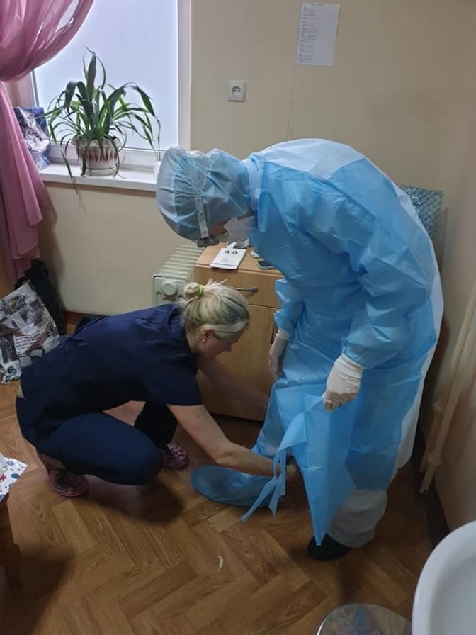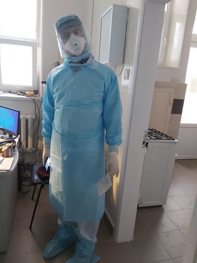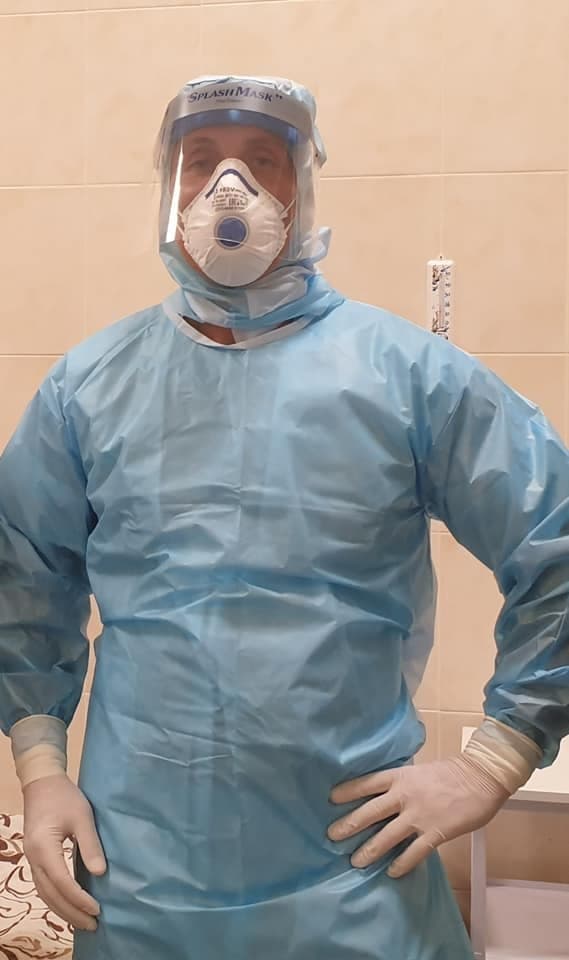 «Цей халат одягають на одяг, а поверх нього ще захисний водонепроникний халат із зав’язками, також окуляри, маску, респіратор. Ми використовуємо це все у комплексі. Халати бувають різного формату, є комплекти. Ми комбінуємо і захищаємося з того, що маємо», – розповів Ігор Берник.