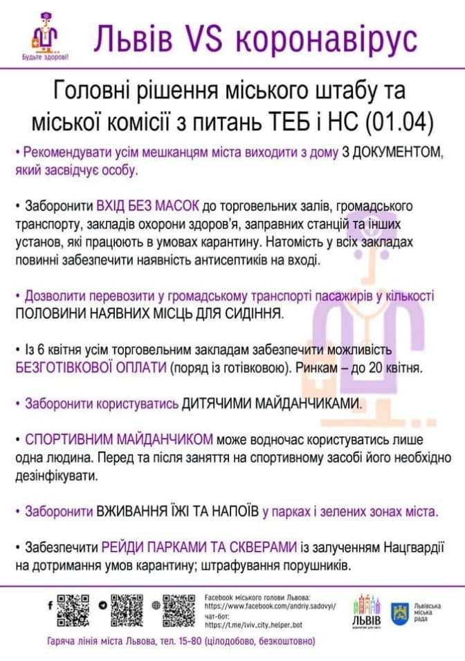 Міська комісія з питань ТЕБ і НС у Львові погодила нові обмеження для мешканців на час карантину, що триватиме до 24 квітня.