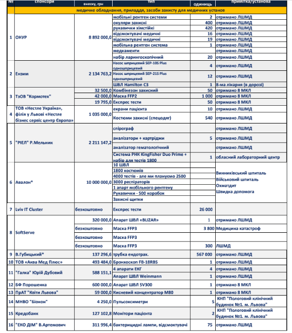 Перелік підприємств, які, станом на 10 квітня, долучились до закупівлі обладнання та захисних засобів.