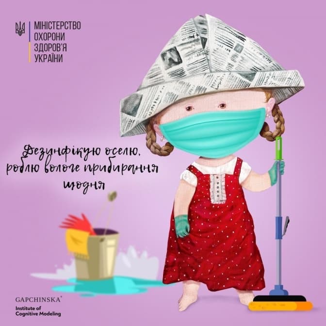 Міністерство охорони здоров’я опублікувало ілюстрації, якими закликають українців залишатися вдома. На ілюстрації з жінкою вказано, що вона залишається вдома й має змогу зробити вологе прибирання й продезінфікувати оселю, а чоловік – пройти онлайн-курси.